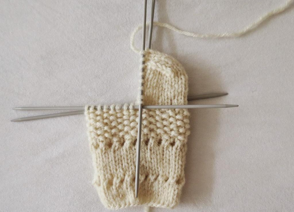 - Dopodiché scriviamo i bordi del tallone dal tallone e iniziamo a lavorare a maglia in cerchio con cinque ferri da calza.