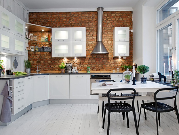 Nell'interno, i mattoni facciali sono più spesso utilizzati dai fan in stile loft. Hanno allineato le pareti del soggiorno e della camera da letto, il grembiule della cucina o una delle pareti della cucina. Inoltre, è perfettamente adatto per la progettazione di una nicchia o di un arco , un camino, un rack o un bancone bar. Per evitare un po 'di oscurità all'interno, usalo principalmente in stanze con luce solare o illuminazione artificiale sufficienti.