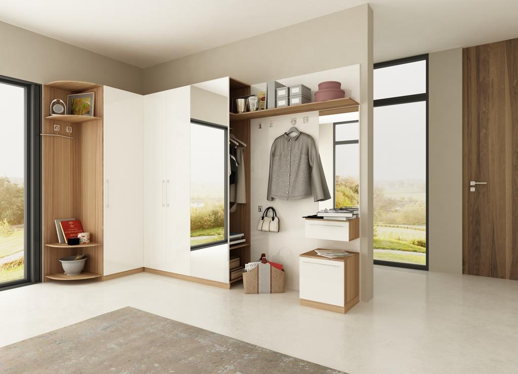 Se il corridoio è molto piccolo, puoi scegliere un armadio ad angolo che richiede molto meno spazio rispetto ai mobili tradizionali e utilizza quello spazio che spesso rimane libero.