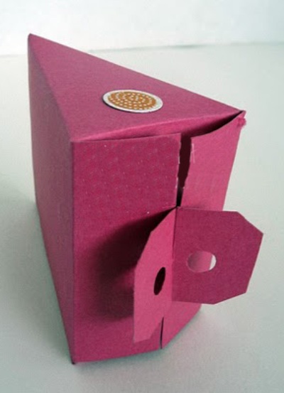 Se usi questo modello, otterrai un pezzo di torta con un coperchio di carta. Tali pezzi di torta di carta possono essere fatti con una sorpresa o mettere un vero pezzo di torta che gli ospiti possono portare a casa con loro.